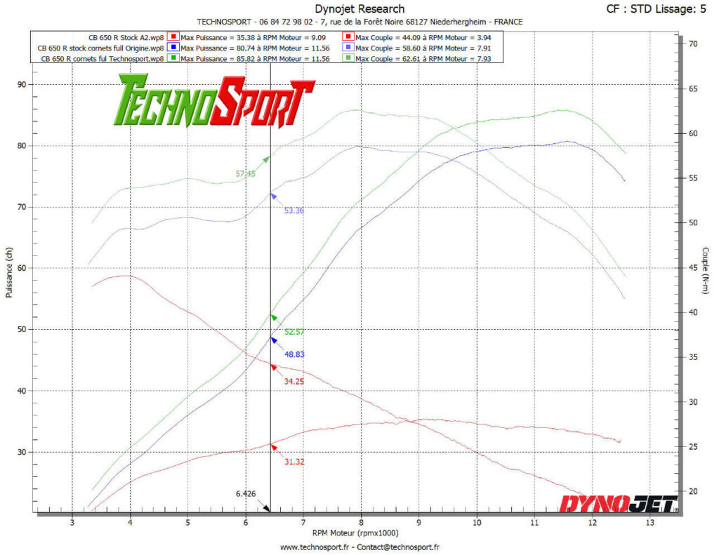 La courbe ci-dessous est la puissance et le couple à la roue donc si vous voulez les données au moteur il faut rajouter 12%.